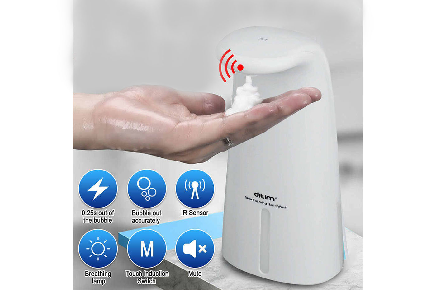 Dispenser di sapone, capace di rilevare il passaggio della mano, ed erogare automaticamente la giusta quantità di prodotto, evitando sprechi.