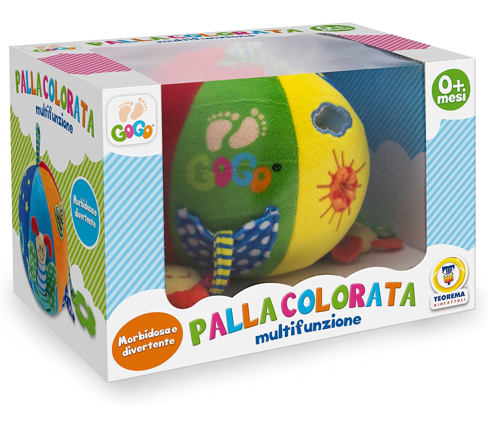 Palla colorata multifunzione che stimola la manualità, la coordinazione, i riflessi e la percezione spazio- temporale.